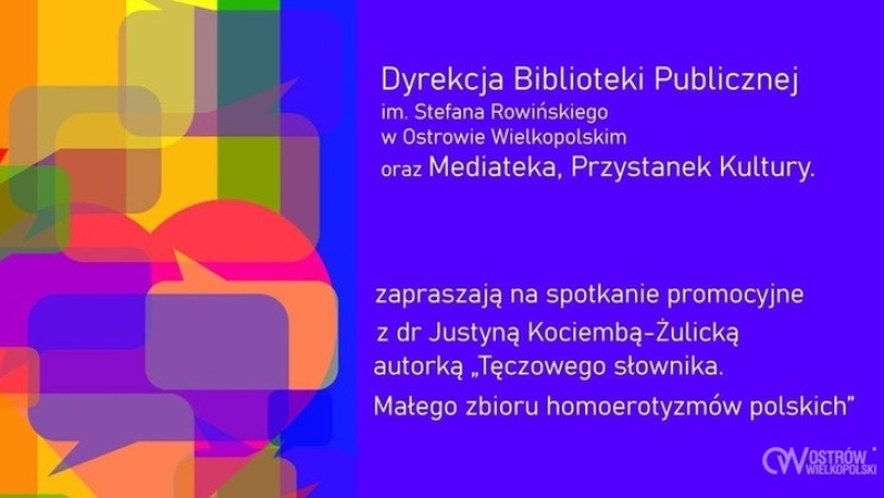 Biblioteka Publiczna im. Stefana Rowińskiego w Ostrowie Wielkopolskim oraz Mediateka, Przystanek Kultury zapraszają na spotkanie promujące nową książkę dr Justyny Kociemby- Żulickiej "Tęczowy słownik: Mały zbiór homoerotyzmów polskich".