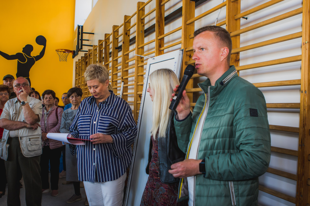 Uczestnicy objazdu obejrzeli także pierwsze efekty inwestycji Szkoły Podstawowej nr 1, gdzie trwa gruntowna modernizacja obiektu. Rozpoczęta w 2022 roku modernizacja i termomodernizacja SP nr 1 przy ulicy Partyzanckiej potrwa do jesieni 2023 r. Nakładem 11,5 mln budynek szkoły przejdzie istną metamorfozę. Prace obejmują m.in. dostosowanie go do potrzeb osób z niepełnosprawnościami, aktualnych wymogów sanitarnych i przeciwpożarowych, częściową wymianę stolarki okiennej i drzwiowej, budowę windy, wymianę instalacji, nowy monitoring oraz sygnalizację włamania i napadu. Celem inwestycji jest zwiększenie bezpieczeństwa uczniów oraz pracowników szkoły. Co istotne, po zakończeniu prac budynek będzie również wyposażony w panele fotowoltaiczne. Dzięki temu rozwiązaniu potrzeby energetyczne placówki w znacznej części będą zaspokajane z zielonej energii. Obiekt stanie się zatem przyjazny środowisku i tańszy w eksploatacji. Aktualnie widać również pierwsze efekty funkcjonalne i estetyczne prac. W sali gimnastycznej zawisły już tablice do kosza, a ściany przyciągają pięknymi kolorami. Nowego wyglądu nabierają również inne pomieszczenia, m.in. szatnie i toalety dla uczniów oraz pomieszczenia dla nauczycieli. Modernizacja budynku SP nr 1 realizowana jest dzięki współfinansowaniu ze środków Mechanizmu Finansowego EOG 2014-2021 oraz budżetu państwa w ramach Programu Rozwój Lokalny, jako jedna z inwestycji projektu „E-Ostrów 2050 – Miasto Ekologiczne, Energetyczne, Ekonomiczne”.