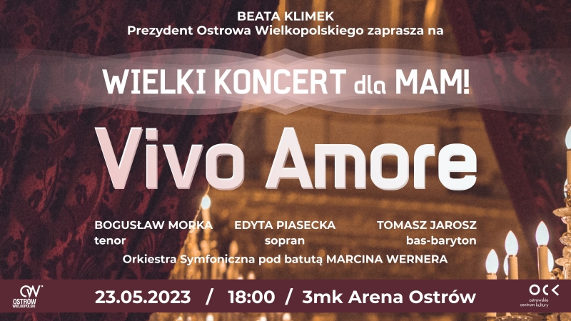 Przed nami pełne miłości spotkanie muzyczne z okazji Dnia Mamy. Gwiazdą wieczoru będzie, uwielbiany w naszym mieście, Bogusław Morka. Na scenie 3mk Areny Ostrów zaprezentuje się w koncercie Vivo Amore wraz z przyjaciółmi wraz z Orkiestrą Symfoniczną Marcina Wernera. Zaprasza Beata Klimek Prezydent Ostrowa Wielkopolskiego.