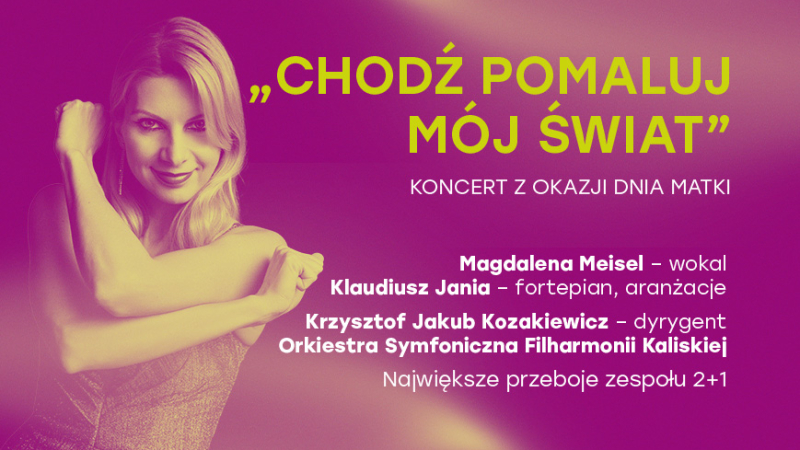Z okazji Dnia Matki Filharmonia Kaliska zaprasza na koncert CHODŹ, POMALUJ MÓJ ŚWIAT, podczas którego usłyszymy największe przeboje zespołu 2 + 1 w wykonaniu obdarzonej wspaniałym głosem wokalistki Magdaleny Meisel oraz pianisty Klaudiusza Jani z towarzyszeniem Orkiestry Symfonicznej Filharmonii Kaliskiej.