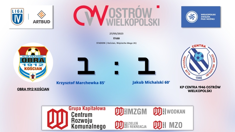 Porażka przed tygodniem z Nielbą pozbawiła Centrę szans na włączenie się do walki o awans, natomiast sobotni remis z walczącą o utrzymanie Obrą Kościan oddalił szanse zajęcia przez ostrowian miejsca na podium IV ligi.