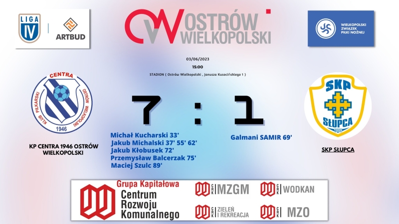 Ostrowianie byli zdecydowanym faworytem pojedynku z zespołem ze Słupcy, który przed tym meczem miał już tylko matematyczne szanse na utrzymanie w IV lidze. Mimo to przez ponad pół godziny goście bronili się dzielnie utrzymując bezbramkowy remis. W 33 minucie Michał Kucharski znalazł w końcu drogę do bramki rywala dając Centrze prowadzenie 1:0. Kilka minut później Jakub Michalski podwyższył na 2:0 i był to kluczowy moment meczu. Po przerwie na boisku panował już tylko ostrowski zespół raz za razem zdobywając kolejne gole. Przy wyniku 4:0 goście zdobyli honorowa bramkę, ale Centra szybko odpowiedziała kolejnymi dwoma trafieniami, a wynik 7:1 ustalił w przedostatniej minucie Maciej Szulc.