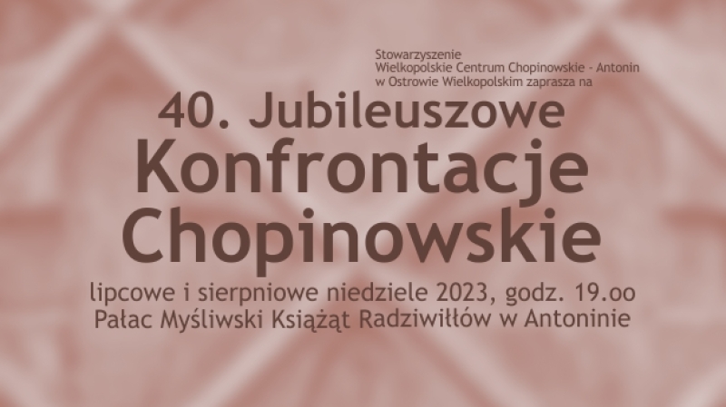 Stowarzyszenie "Wielkopolskie Centrum Chopinowskie - Antonin" w Ostrowie Wielkopolskim zaprasza na 40. Jubileuszowe Konfrontacje Chopinowskie, które odbywać się będą się w Pałacu Myśliwskim w Antoninie, w lipcowe i sierpniowe niedziele bieżącego roku.