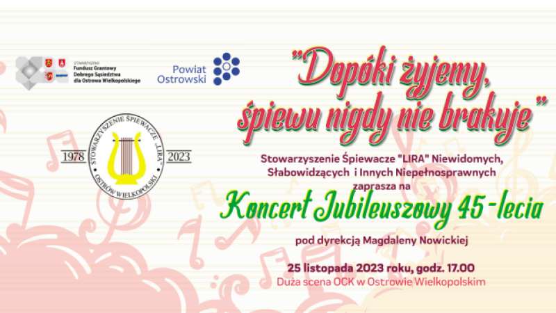 Stowarzyszenie Śpiewacze „LIRA” Niewidomych, Słabowidzących i Innych Niepełnosprawnych w Ostrowie Wielkopolskim zaprasza na Koncert Jubileuszowy 45-lecia działania chóru pt. „Dopóki żyjemy, śpiewu nigdy nie brakuje” pod dyrekcją Magdaleny Nowickiej.