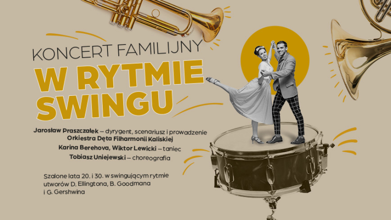 W Rytmie Swingu – familijny koncert karnawałowy odbędzie się w niedzielę, 28 stycznia o godz. 12.00 w Sali Koncertowej Filharmonii Kaliskiej (Aula UAM). Bilety w cenie 40 zł (osoba dorosła/opiekun) i 30 zł (dziecko) do nabycia online poprzez stronę filharmoniakaliska.pl i serwis bilety24.pl oraz w kasie Filharmonii Kaliskiej, przy ul. Aleja Wolności 2. Wyłącznie w kasie Filharmonii Kaliskiej są także dostępne bilety familijne w cenie: 120 zł (cena obejmuje 2 osoby dorosłe oraz 2 dzieci, dla każdego kolejnego dziecka bilet w cenie 20 zł). Dla dzieci do lat 4 siedzących na kolanach opiekuna przewidziano bezpłatny wstęp.