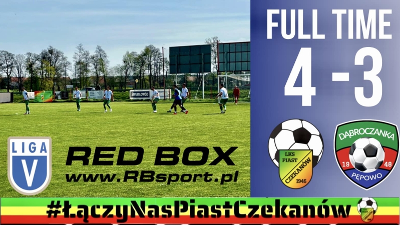 Przerwa najwyraźniej nie pomogła gościom w otrząśnięciu się po szybkiej stracie dwóch goli bo krótko po wznowieniu Nathaniel Zakosztowic po raz drugi wpisał się na listę strzelców dając Piastowi prowadzenie 3:2, zaś okres dobrej gry czekanowian zwieńczył w 70 minucie golem na 4:2 Szymon Zakosztowicz. Na tym jednak nie zakończyły się emocje w tym meczu, gdyż w 85 minucie Dąbroczanka zdobyła trzecią bramkę i zrobiło się nerwowo, goście bowiem zwietrzyli swoją szansę na uratowanie remisu i rzucili się do ataku. Nic jednak nie wskórali i ostatecznie Piast zrewanżował się Dąbroczance za porażkę z jesieni wygrywając 4:3 i zrównując się z nią punktami w tabeli Red Box V ligi.