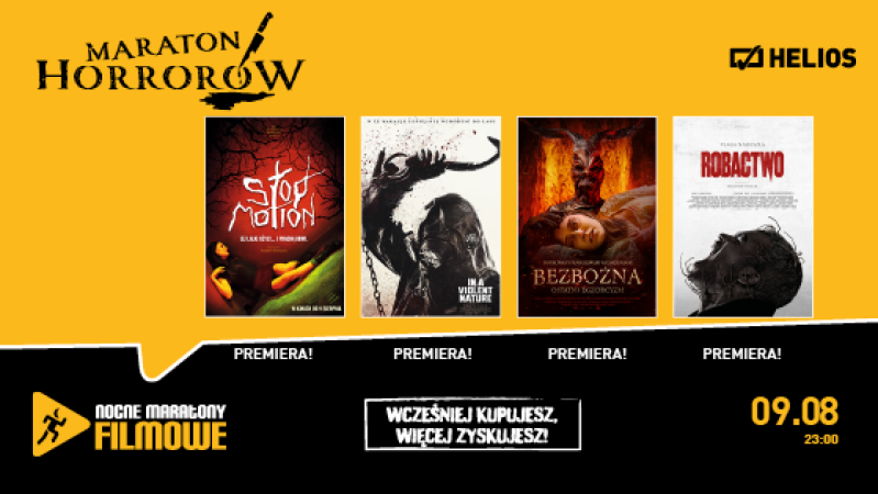 W piątek 9 sierpnia, kina Helios zapraszają na noc z filmami, przez które jeszcze długo będziecie zasypiać przy włączonym świetle… Zaczniemy długo wyczekiwanym „STOPMOTION” w którym utalentowana animatorka ulega twórczej obsesji, a przerażający bohaterowie nowego projektu wymykają się spod jej kontroli. Po krótkiej przerwie przeniesiemy się do upiornego lasu w „IN A VIOLENT NATURE” i dalej na odludzie w filmie „BEZBOŻNA: OSTATNI EGZORCYZM”. Na finał, dla wszystkich którym wystarczy odwagi - „ROBACTWO”. Jesteśmy przekonani, że taka dawka obezwładniającego strachu jeszcze długo po powrocie do domu nie pozwoli Wam zasnąć. Czy jesteście na to gotowi?