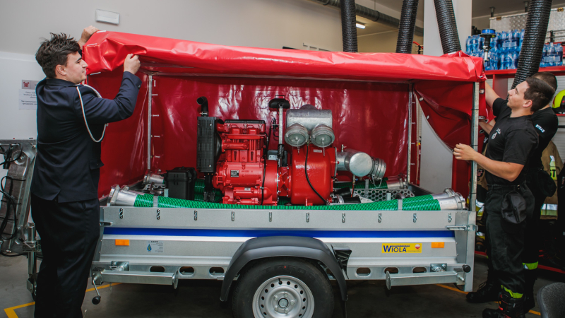 Motopompa do zanieczyszczonej wody wraz z przyczepą uzupełniła sprzęt strażaków ochotników przy ulicy Staszica. Długi czas pracy, szybkie uruchamianie, łatwa obsługa… strażacy wymieniają same plusy nowego sprzętu.