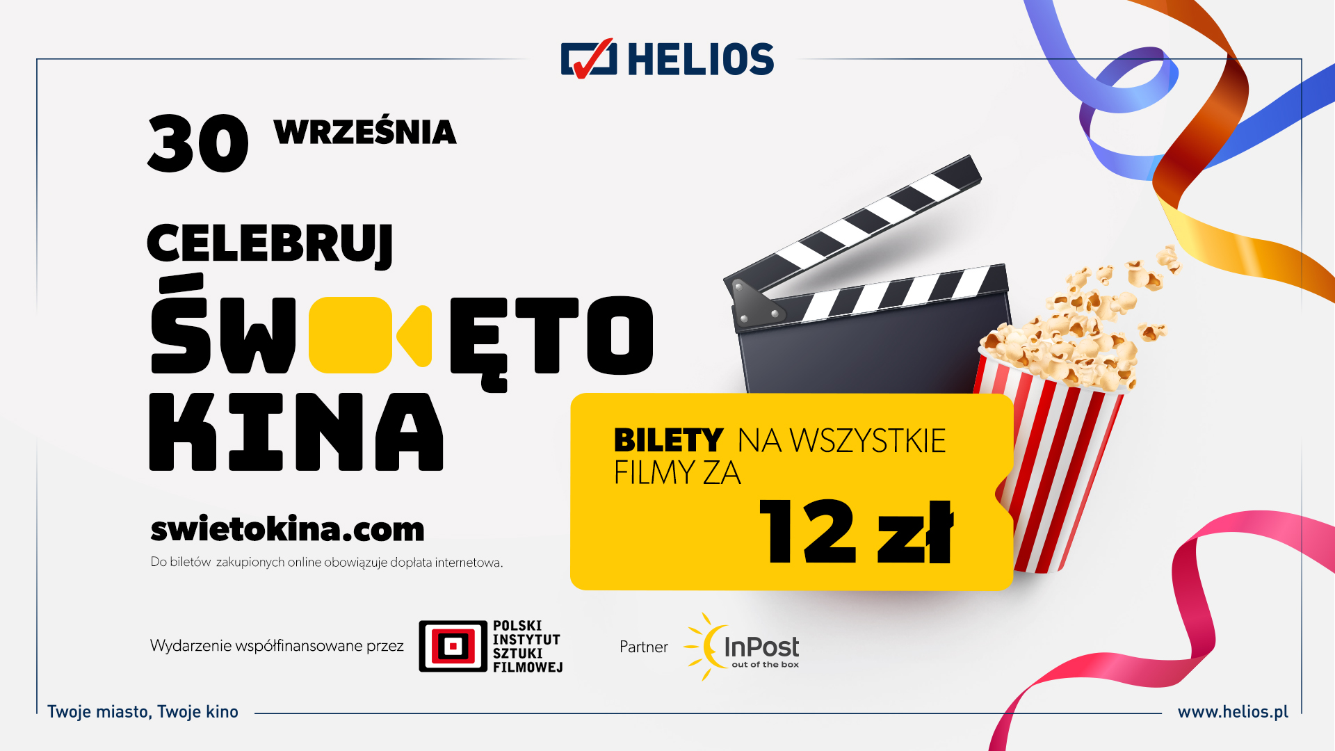 W sobotę, 30 września bilety do kin w całej Polsce będą kosztować tylko 12 złotych! To idealny czas, aby dołączyć do magicznego świata filmu. W repertuarze kin Helios znajdą się najnowsze premiery, takie jak: „Piła X”, „Doppelgänger. Sobowtór” czy „Twórca”. Widzowie będą mogli zobaczyć również najpopularniejsze filmy z bieżącego repertuaru: „Zielona granica”, „Niezniszczalni 4”, „Kosmici w mojej s...