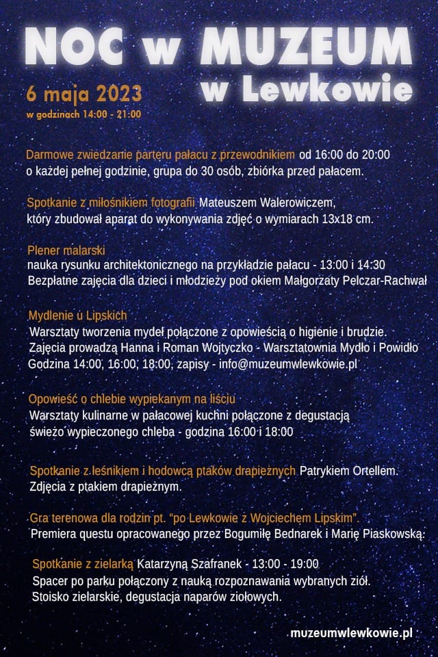 W sobotę 6 maja 2023r. Muzeum w Lewkowie Zespół Pałacowo-Parkowy organizuje Noc w Muzeum. – Zapraszamy od godziny 14.00, najlepiej dojechać do nas rowerem. Przygotowaliśmy wiele atrakcji, w których udział mogą brać całe rodziny – zachęca dyrektor Muzeum Sylwia Nowicka.