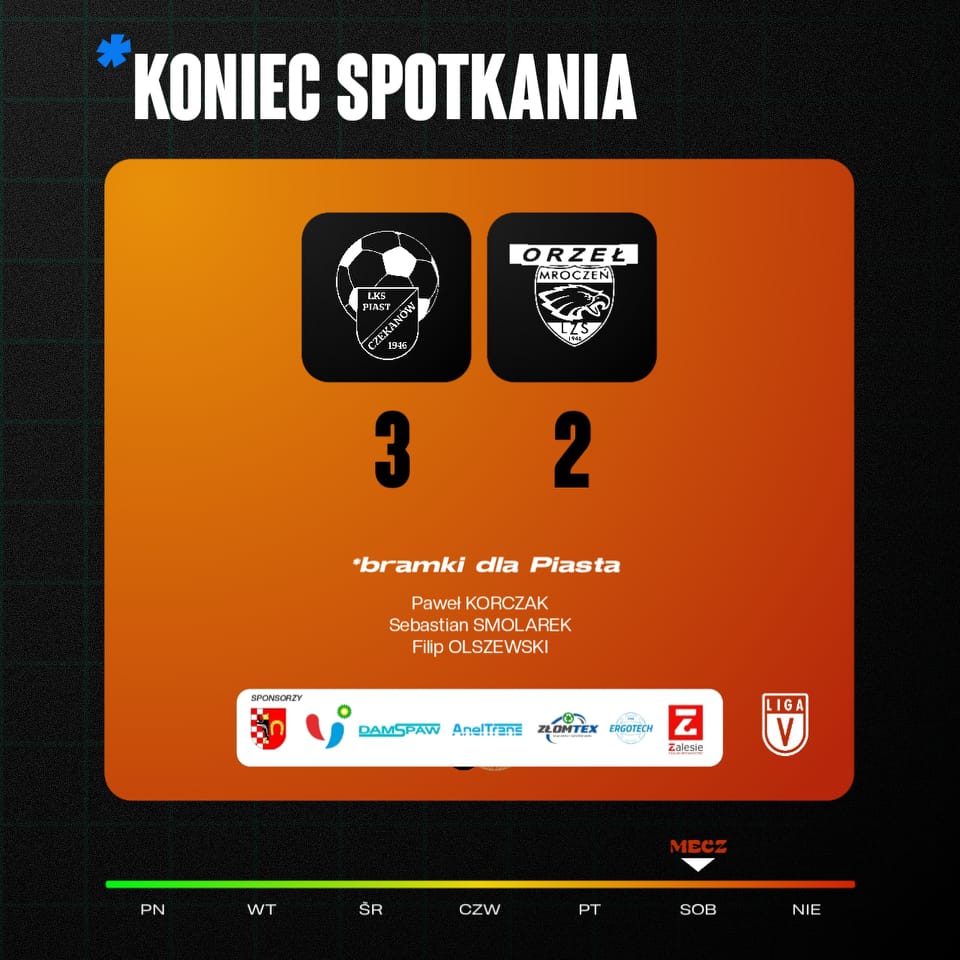 Piłkarze Piasta Czekanów pokonali 3:2 Orła Mroczeń i są coraz bliżej „podium” V ligi.
