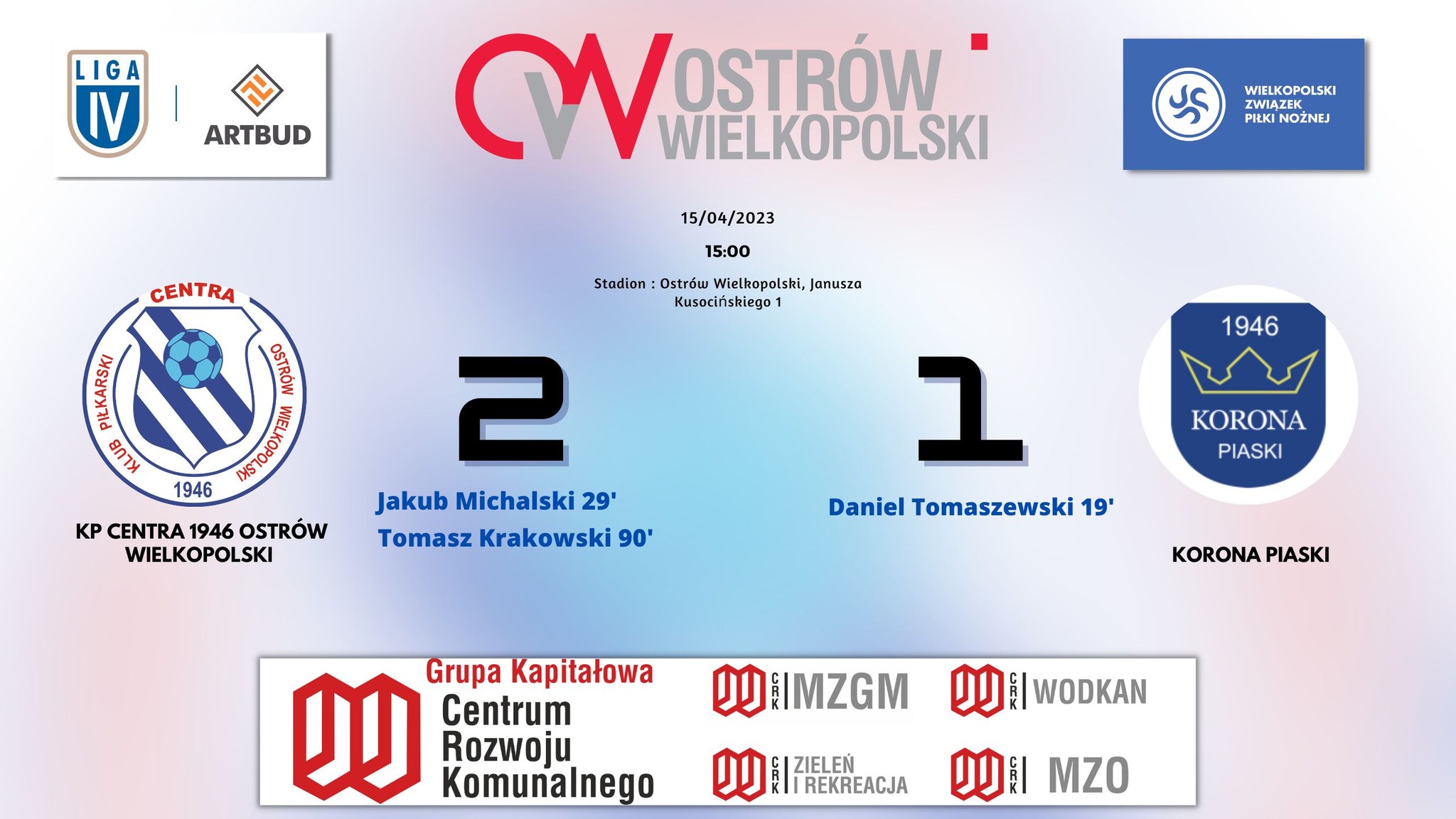 Piłkarze Centry pokonali 2:1 Koronę Piaski umacniając się w czołówce tabeli IV ligi.