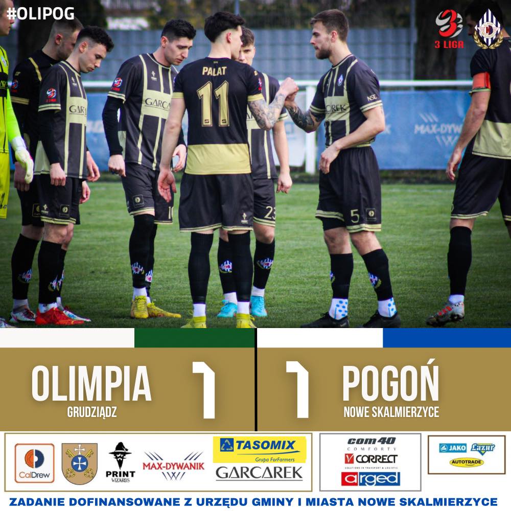 Cenny punkt wywalczyli piłkarze Pogoni Nowe Skalmierzyce remisując na wyjeździe z liderem III ligi Olimpią Grudziądz 1:1.