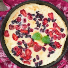 W misce wymieszać lub zmiksować jogurt z jajkami i 2 łyżkami oleju, dodać cukier, mąkę przesianą z proszkiem do pieczenia i solą. Wymieszać lub zmiksować do połączenia się składników w gładką masę. Na rozgrzaną patelnię z olejem roślinnym łyżką nakładać placuszki zachowując odstępy, gdyż będą rosły. Po zwiększeniu objętości placków wkłądamy do każdego kilka plasterków truskawek, śliwek lub kilka porzeczek czy malin. Smażymy z obu stron do uzyskania rumianego koloru.